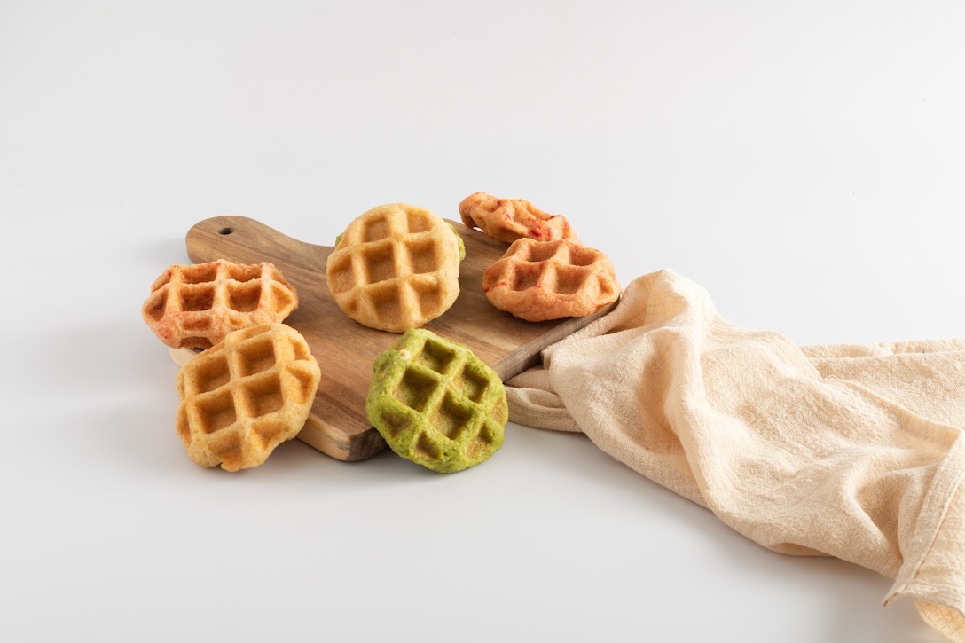 以比利時鬆餅為設計發想,加入雞肉一起製成,並以米麵包的方式製作,替代掉易過敏的麵粉,讓毛孩在大口食用時也不必擔心癢癢上身。