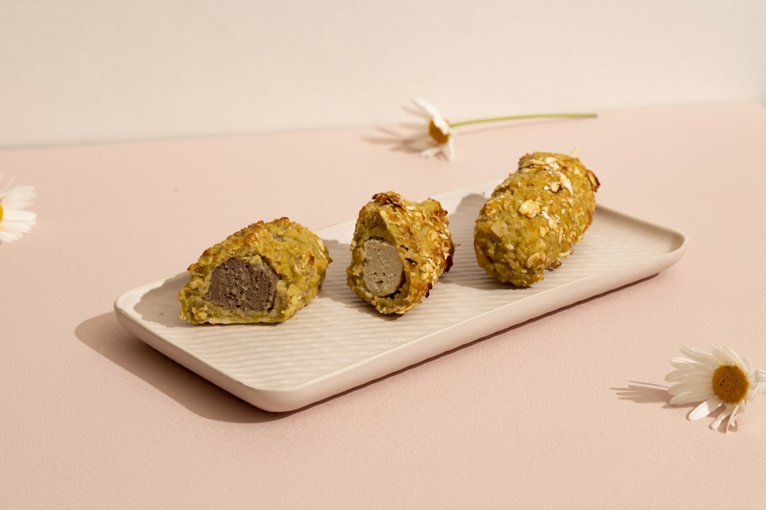 改良人食版的炸熱狗,以燕麥及蔬菜做搭配製成外皮取代粉漿,將肉條裹入其中。